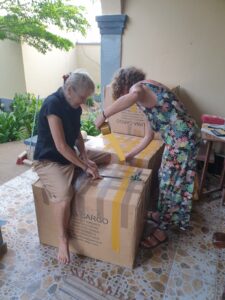 Die bereits eingetroffenen Pakete lagern schon bei unserem Partner Momo. Einige sind noch unterwegs. Darin befindet sich zum Beispiel ein Kaufladen und anderes Spielmaterial für die Kindergärten, weitere Tornister für den Schulanfang im September und getragene Kleidung.