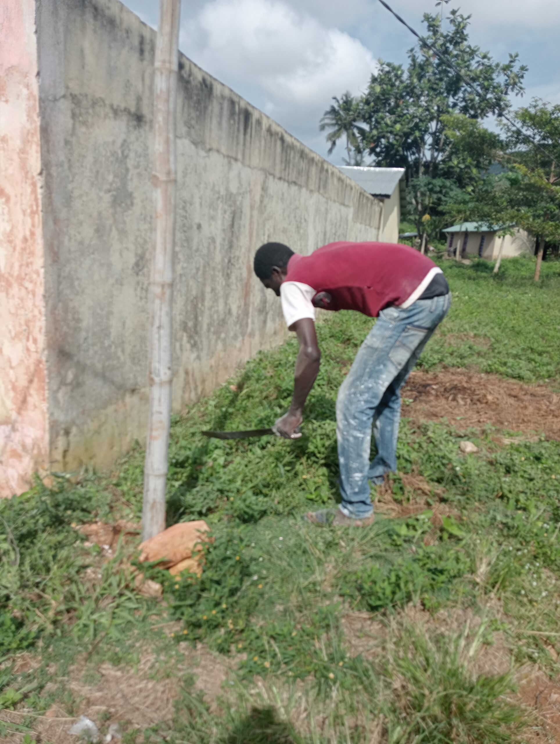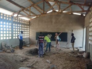 Mit Husten, Schnupfen, Heiserkeit und Fieber begab ich mich auf die Fahrt und stand am Montag, dem 7. Juli, auf der Baustelle. Die Familie vom Kindergartenleiter Abalo versorgte mich mit Mittagessen und einen Ruheraum für die Mittagspause. Maurer und in diesem Fall auch Bauleiter Aimé stellte eine emsige Truppe von Maurern zusammen und alles entwickelte sich prächtig – siehe folgende Bilder.