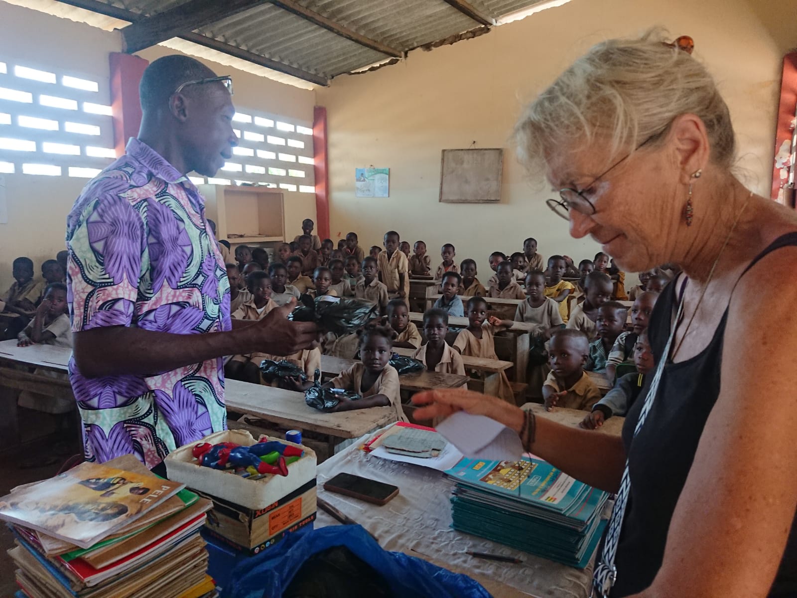 Die Trinkflaschen haben wir dem Schulleiter in Vogan übergeben. Mit den Tornistern, den Materialien und der Schulkleidung werden die Erstklässler zu Schuljahresbeginn im September damit beglückt.