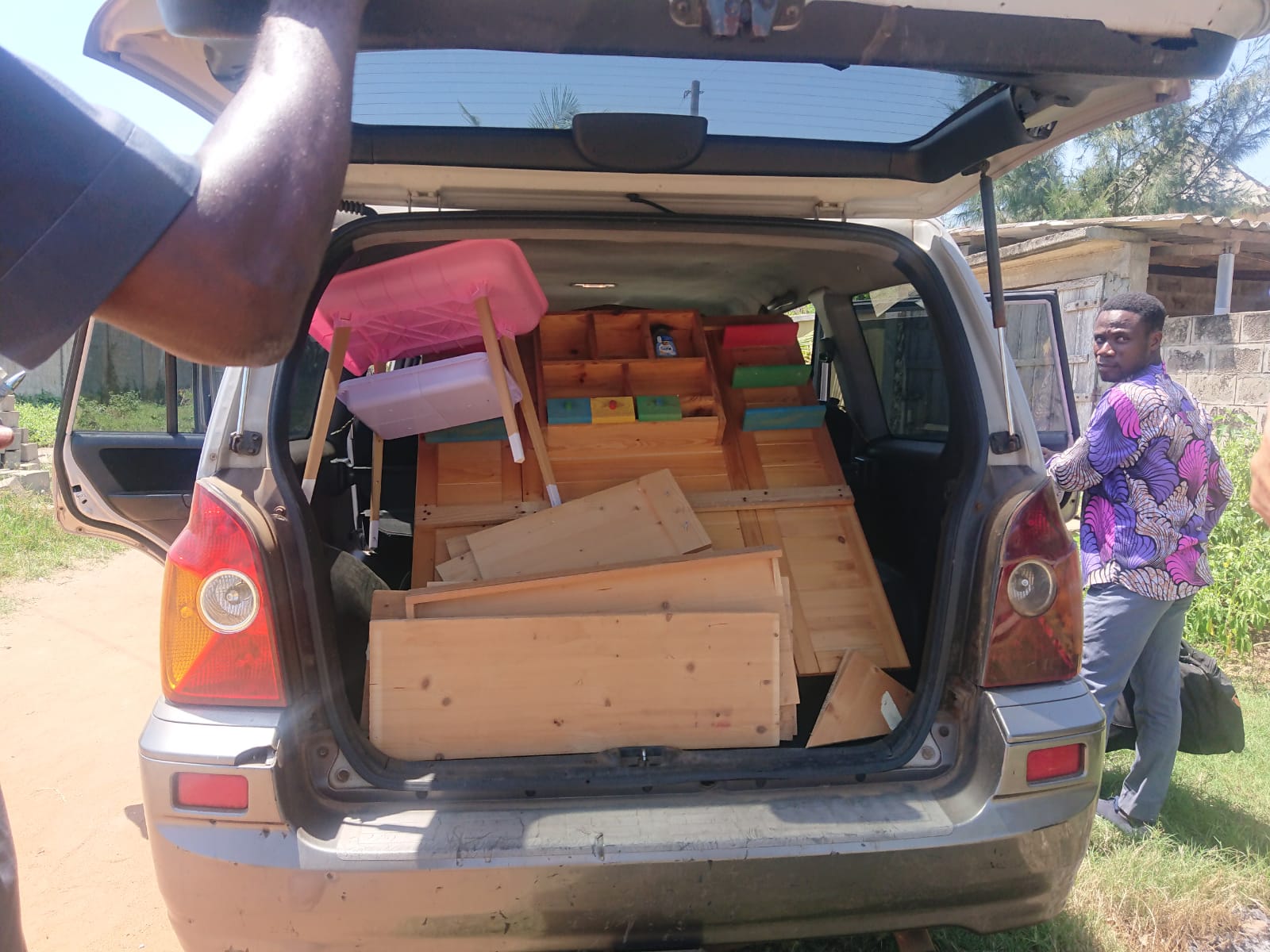 Schulleiter Felix der Schulein Agbodrafo holt den Kaufladen und einen Puppenwickeltisch bei uns ab. Letztendlich haben wir es vor der Abreise noch geschafft, den Kaufladen für den Kindergarten in Agbodrafo aufzubauen.